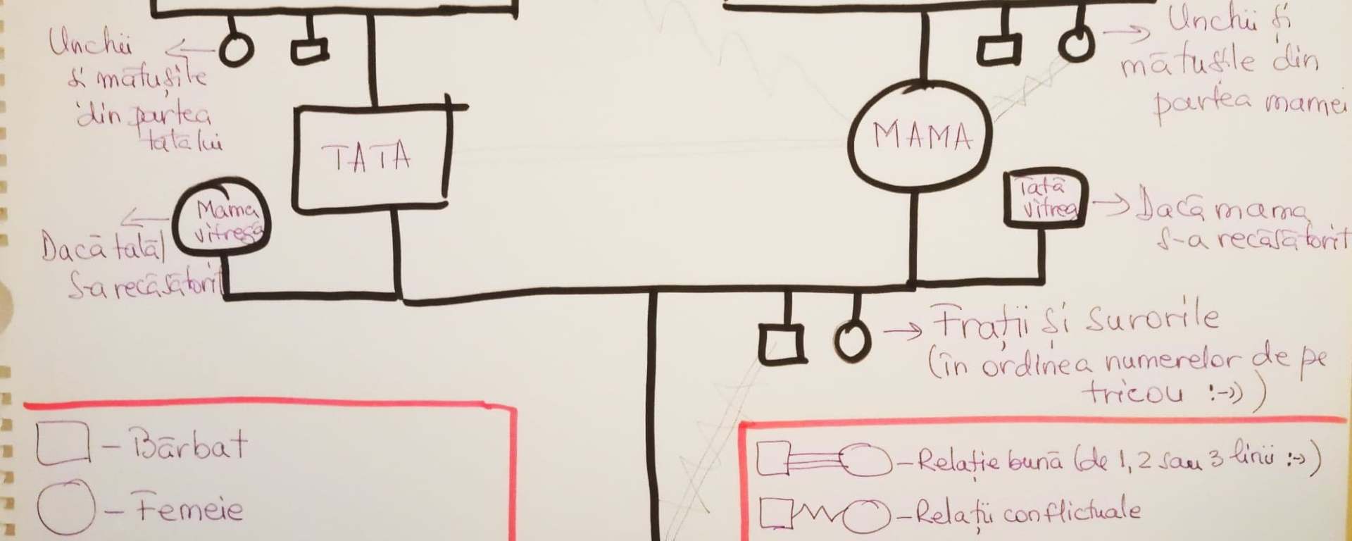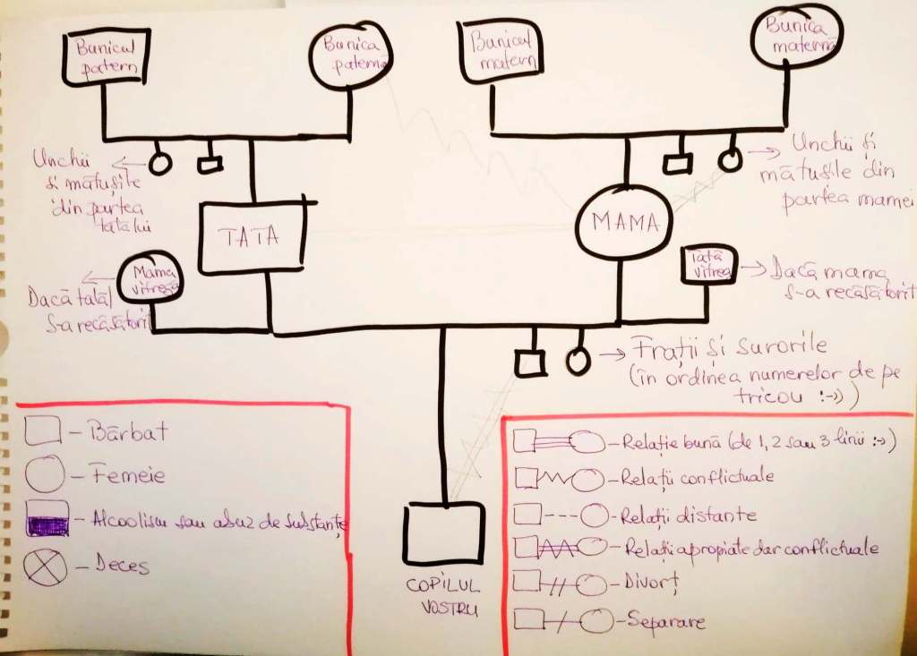 😀 Vă recomand să faceți un joc împreună cu copiii voștri. Să le faceți genograma așa cum v-am desenat-o și o puteți vedea în poză. Genograma este un instrument de lucru din psihoterapia de familie care, pe lângă faptul că alcătuiește arborele genealogic al persoanei în care fiecare rudă este pusă la locul ei 🙂 putem să trasăm tipul de relație pe care fiecare a avut-o cu fiecare și putem să spunem 3 (sau mai multe) cuvinte care să descrie fiecare persoană. Chiar dacă aveți un copil prea mic ca să poată să înțeleagă și să participe la „jocul” ăsta eu zic că vă va fi de folos peste mulți ani, când va putea înțelege. Veți putea atunci să vă așezați în tihnă și să îi povestiți de zilele alea în care lumea părea că s-a oprit în loc și, pentru că era o perioadă în care reînvățam să nu mai alergăm bezmetici, v-ați putut opri și ați reușit să vă aduceți aminte de lucrurile care cu adevărat contează. Iar locul de unde vin, moștenirea – atât cea bună cât și cea întunecată, de care ne ferim să vorbim sau o facem trunchiat și în șoaptă – toate ne reprezintă și ne influențează felul în care gândim și ne raportăm la viață.