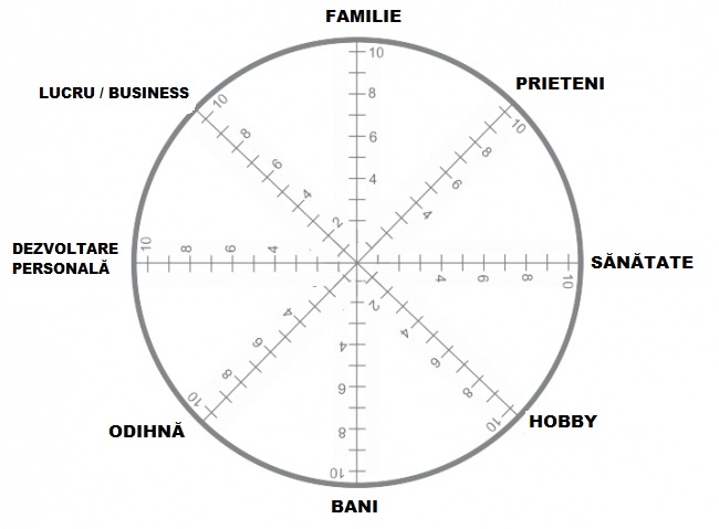 Dacă nu aveți imprimantă în casă puteți să desenați pur și simplu un cerc exact ca în imagine și după aceea, într-un moment de mare sinceritate față de voi înșivă, evaluați „cum stați” la fiecare rubrică și dați o notă. Adică, puneți un punct la nivelul la care considerați că sunteți acum în ceea ce privește munca, familia, banii, etc.