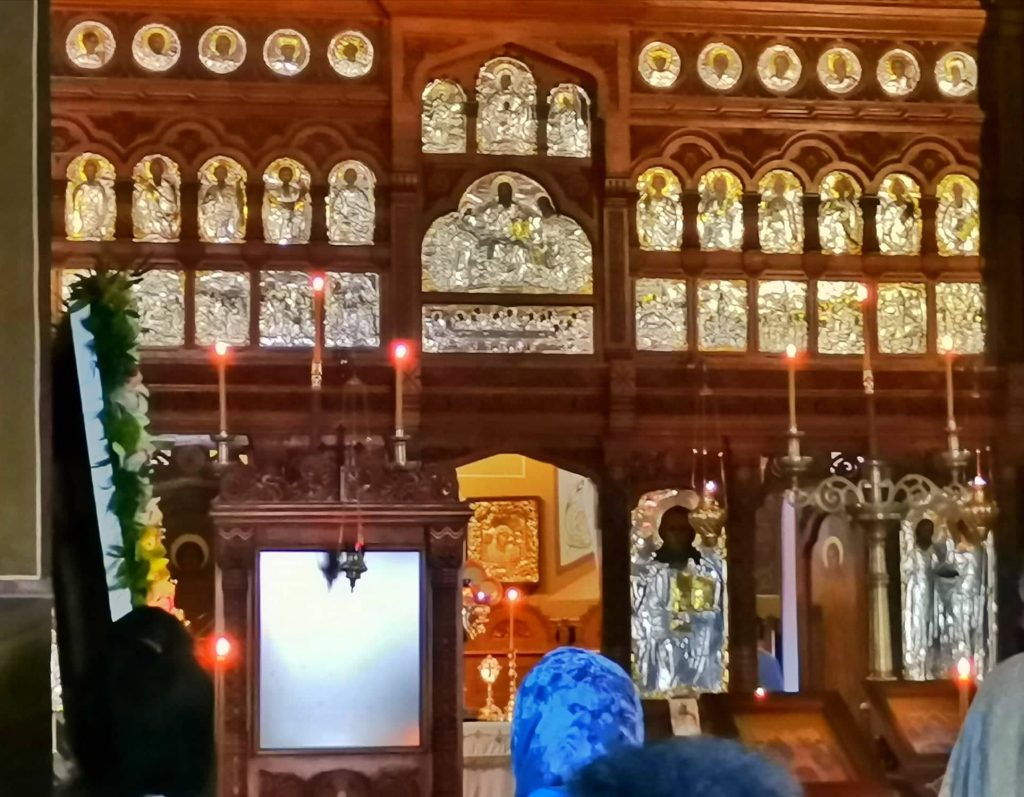 Nu am trecut pe la toate icoanele doar m-am băgat într-un colț încercând să obțin un pic de liniște ca să plec mai departe și să pot duce la bun sfârșit și ziua aceea. Când m-am uitat spre altar din unghiul în care eram, așa cum cădea lumina, în locul icoanei ziceai că este o oglindă.