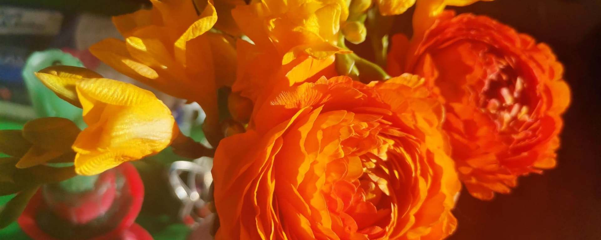 Astea sunt florile pe care mi le-am cumpărat ieri și care sunt atât de frumoase scăldate în lumina zilei de azi. Și ele reprezintă alte motive să fiu recunoscătoare.