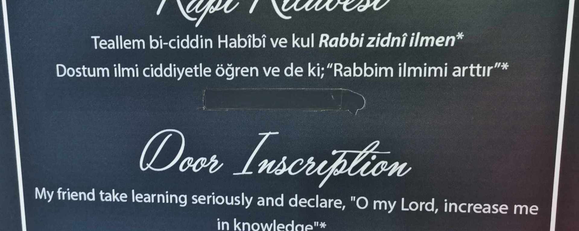 Ușa pe care este inscripția: „Prietenul meu ia în serios învățarea și spune: „O, Doamne, mărește-mă în cunoaștere”.